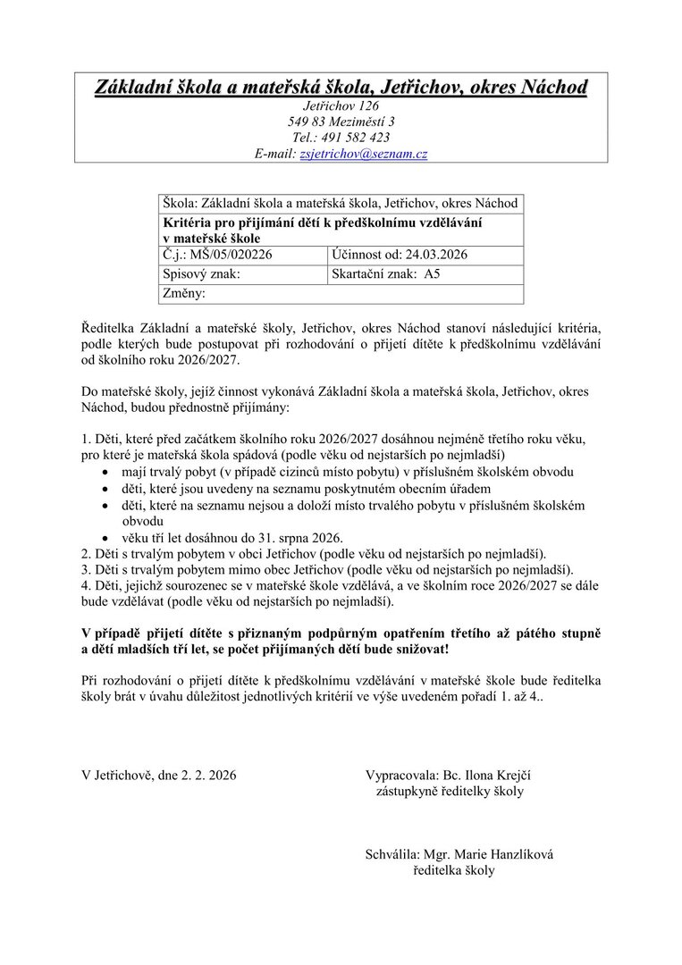 adresa zřizovatele: Obecní úřad Jetřichov, Jetřichov 126, 549 83 Meziměstí 3