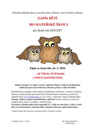 Zápis dětí do 1. ročníku se uskuteční ve středu 11.2.2026 od 14 do 16 hodin v prostorách školy. Podrobné info bude zvěřejněno zde na stránkách.